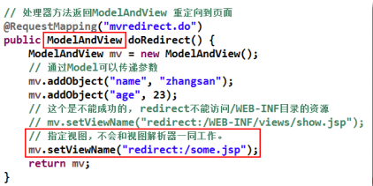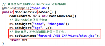處理器方法返回 ModelAndView 時,需在 setViewName()指定的視圖前添加 forward:,且此時的視圖不再與視圖解析器一同工作,這樣可以在配置了解析器時指定不同位置的視圖。視圖頁面必須寫出相對于項目根的路徑。forward 操作不需要視圖解析器。