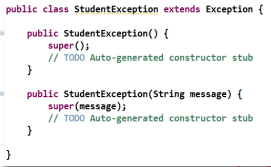 定義三個(gè)異常類:NameException、AgeException、StudentException。其中 StudentException 是另外兩個(gè)異常的父類。