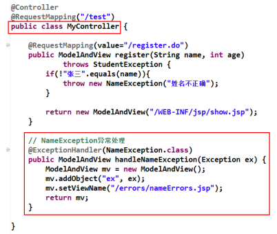 而被注解的方法,其返回值可以是 ModelAndView、String,或 void,方法名隨意,方法參數(shù)可以是 Exception 及其子類對(duì)象、HttpServletRequest、HttpServletResponse 等。系統(tǒng)會(huì)自動(dòng)為這些方法參數(shù)賦值。