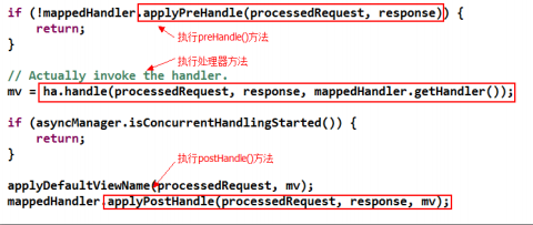 查看中央調(diào)度器 DispatcherServlet 的 doDispatch()方法源碼:在執(zhí)行處理器方法之前, 會(huì)執(zhí)行處理器執(zhí)行鏈對(duì)象 mappedHandler 的 applyPreHandle()方法。然后執(zhí)行 Handler,最后 執(zhí)行處理器執(zhí)行鏈對(duì)象的 applyPostHandle()方法。