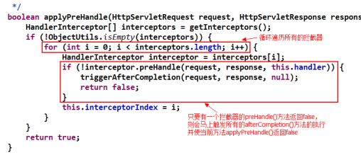 applyPreHandle()方法的返回結(jié)果取決于執(zhí)行鏈中的每一個(gè)攔截器的 preHandle()方法。只要 有一個(gè) preHandle()方法返回 false,則其就會(huì)返回 false。然后就執(zhí)行了 return;即結(jié)束了 doDispatch()方法,即該請(qǐng)求的處理結(jié)束。