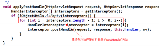 對(duì)于處理器執(zhí)行鏈的 applyPostHandle()方法,其是循環(huán)倒序執(zhí)行所有攔截器的 postHandle()方法的。