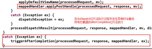 在 doDispatch()方法中也存在一個(gè) catch(){}語(yǔ)句,表示若發(fā)生異常,則會(huì)調(diào)用執(zhí)行 triggerAfterCompletion()方法。