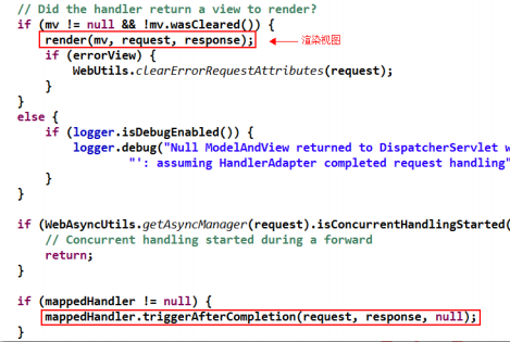 查看中央調(diào)度器 DispatcherServlet 的 processDispatchResult()方法源碼可知,在對(duì)視圖渲 染過(guò)后,會(huì)調(diào)用執(zhí)行處理器執(zhí)行鏈的 triggerAfterCompletion() 方法,即執(zhí)行所有的 afterCompletion()方法。